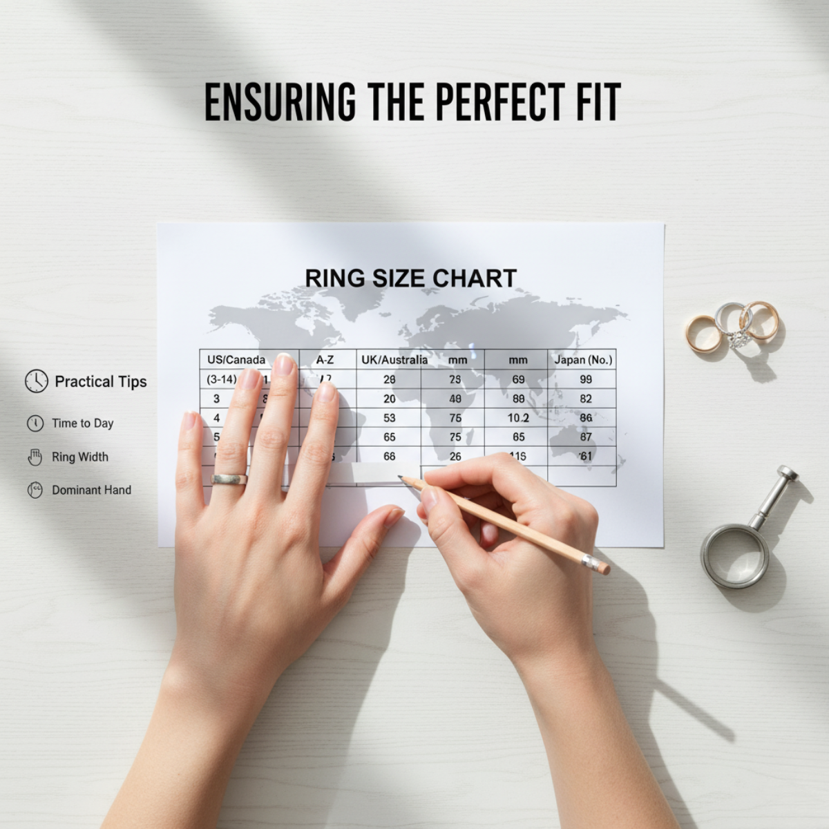 Measure your finger size at different times of the day, since fingers tend to swell in the evening or in warmer temperatures.